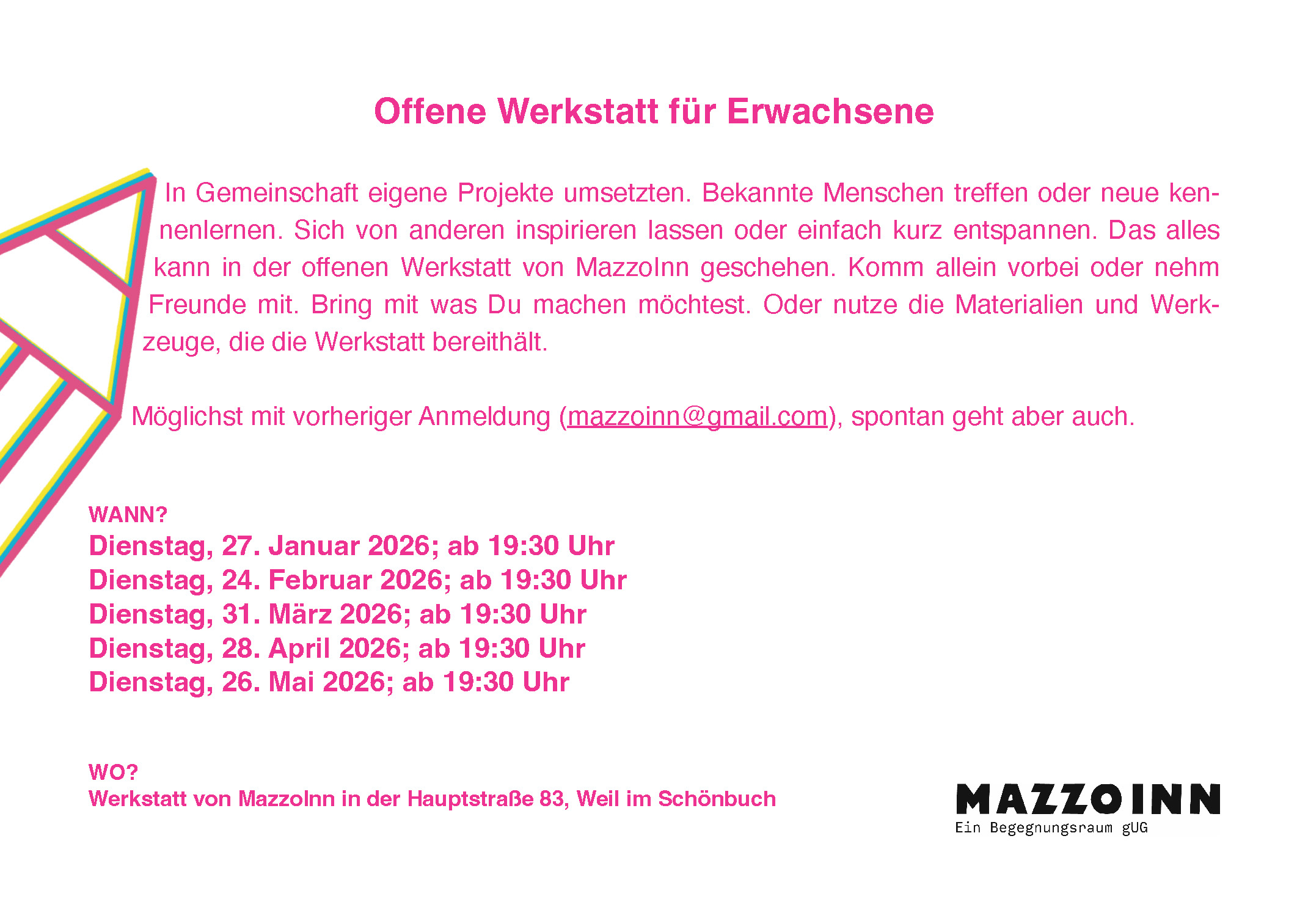Offene Werkstatt für ErwachseneVon Admin / 25. März 2026 2 Veranstaltungen wurden gefunden. Ansichten-Navigation Veranstaltung Ansichten-Navigation Zusammenfassung Liste Monat Tag Heute Anstehend Anstehend Datum auswählen. Apr. 2026 Di. 28 19:30 - 19:30 Offene Werkstatt für Erwachsene Mai 2026 Di. 26 19:30 - 19:30 Offene Werkstatt für Erwachsene Vorherige Veranstaltungen Heute Nächste Veranstaltungen Kalender abonnieren Google Kalender iCalendar Outlook 365 Outlook Live .ics Datei exportieren Exportiere Outlook .ics Datei